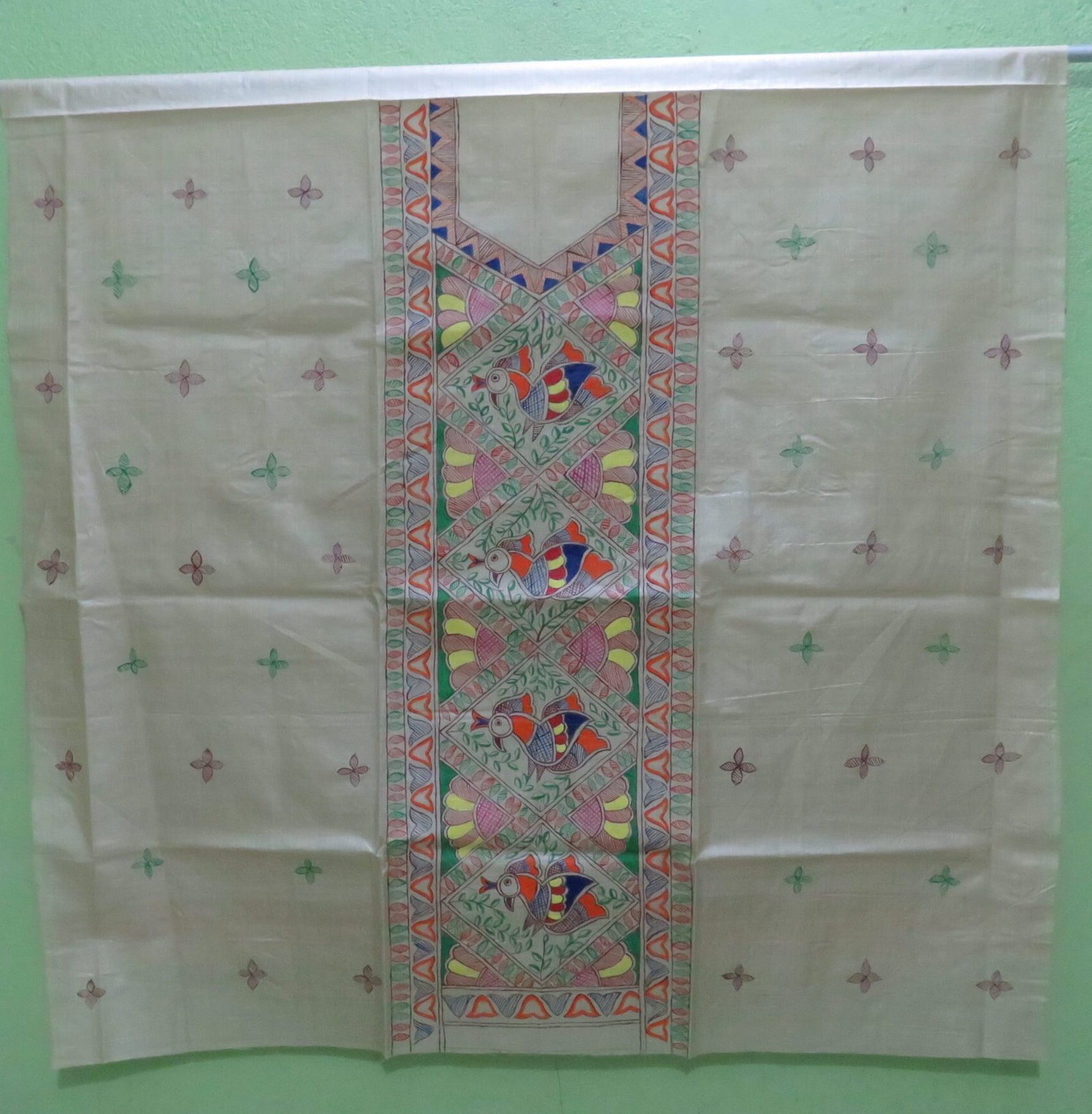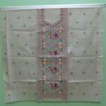The neckline is elegantly designed with a U-shaped embroidered pattern, enhancing the upper portion of the dress, while the bottom portion showcases floral and geometric motifs for a balanced traditional finish.